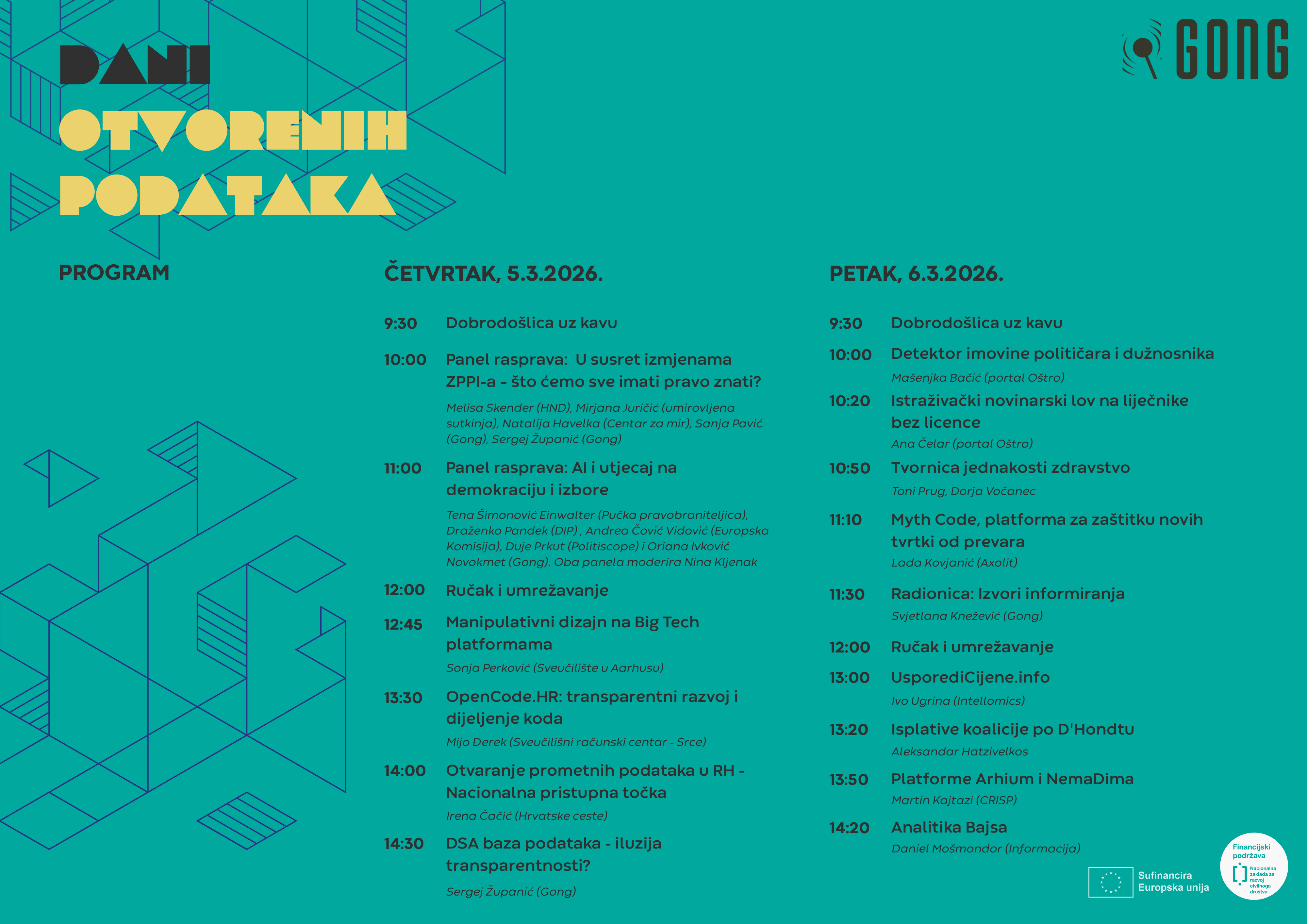 Gong vas poziva na Dane otvorenih podataka (Open Data Days), na konferenciju kojom već 13 godina zagovaramo otvaranje podataka kao jedan od važnih alata građanskog nadzora i informiranja javnosti. Panel rasprave, izlaganja i predavanja organiziramo ove godine 5. i 6. ožujka 2026. u prostoru ZgForum (Gajeva 27, Zagreb).